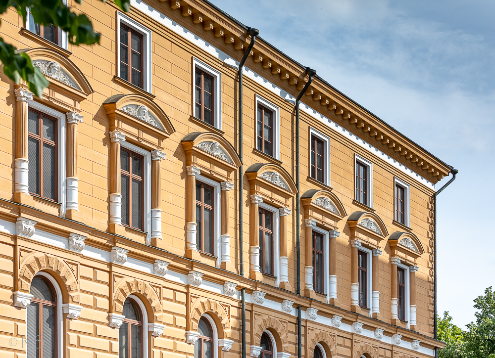 Lenkillä olin siis kaupungilla, ja enimmäkseen suuntasin kameraani kohti yläilmoja. Nykyisen kaupungintalon Hallituskadun puoleisella seinällä on näin komea korinttilaisten pylväiden rivistö.