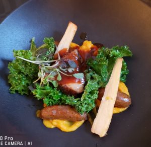 Villaporsasta kahdella tapaa, calvadoskastiketta, kurpitsapyreetä, juuripersiljaa ja lehtikaalia