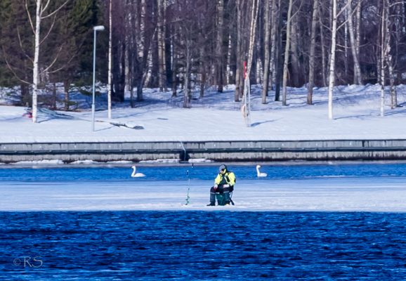 Tänään kuulin joutsenten äänen, vai kuulinko sittenkään? Lenkillä kävelin kohti niitä, olisinpa kävellyt vielä enemmän kohti. Kyllä ne olivat joutsenia! Olin kävelemässä Kuusisaressa (jonka jalkakäytäviä ei ollut hiekoitettu ja olin ilman nastakenkiä, koska tarkoitus mennä myös kauppoihin, joissa en tykkää kävellä nastat napsuen. Se tekee eläkeläisvaikutuksen; ja minähän edelleen kiistän olevani lähelläkään eläkeikää. Saatikka eläketuloja. 😉 Mutta siis, minkä kuvan menetinkään, kun olin niin kaukana. Tässä se Kuusisaaresta Hietasaareen otettu otos; on pilkkijä ja on joutsenet, mutta miten kaukana!! Mutta siellä on ne joutsenet! On kevät!