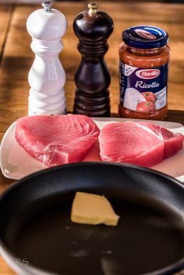 Ota pihvit ajoissa huoneenlämpöön. Teen lisukkeet (meillä tsatsiki-salaattia ja bulguria) valmiiksi, kuumenna voi ja paista tonnikalaa pari minuuttia puoleltaan. Korkeintaan pari minuuttia: pinnan on oltava ruskea mutta file ei saa kypsyä sisältä. Kaada ricottakastike pannulle, kuumenna, anna hetki kypsyä, sammuta levy ja anna kalan imeä makua. Paistaessa suolaa ja pippuroi. Lopuksi ripottele pinnalle parmesan-raastetta. Helppoa, hyvää ja tänään tarjouksen myötä halpaakin.