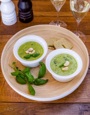 Ja alkuruokana meillä oli astetta parempi hernekeitto. Sellainen perjantain hernesoppa: cashewpähkinöitä ja basilikaa. Simppeliä, hyvää ja toistekin tehtävää keittoa, jota äidillekin tuli samalla keittämisellä moneksi kerraksi.