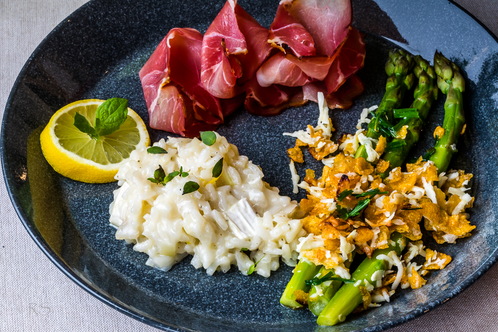 Kun kokeiltavia ruokia ja varsinkin uusia keittoideoita löytyi useampikin, kauppalappu venyi aikamoisen pitkäksi. Liki kaiken tarvittavan löysin meidän lähikaupasta. Ja kyllähän se väistämätöntä oli, että parsaa oli tänään. Sen valmistin ”vanhalla” ohjeella: Kellogg´s-pecorino-kuorrutus. On se vaan hyvä ja helppo. Ja sitten oheen – ei suinkaan prosciuttoa, kuten tavallista vaan – speckiä. Savustettua ilmakuivattua kinkkua. Pirkka-merkkinen on ihan kelpoa, mutta kyllä kaipasin sellaista speckiä, jota oli Wienissä hotelliaamiaisilla. Ja sitten oheen sitä sitruuna-vuohenjuustorisottoa.