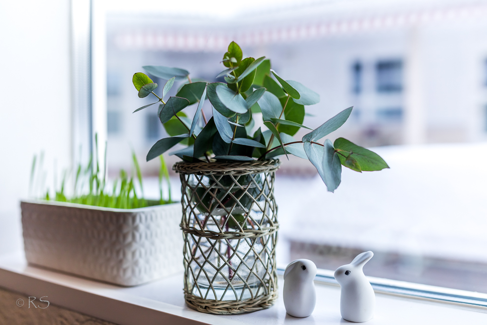 Eucalyptuksen oksat ovat kyllä mukavia; tai siis ne on halpoja, ne kestävät vaikka kuinka kauan, ne tuovat vihreää sisälle ja niitä voi ripotella pienissä purkeissa vähän joka puolelle huuskollia. Minulla taitaa olla nyt kolme pientä purkkia, ja vielä yksi iso Festassa. Tänään – samalla kun kävin ostamassa Miniälle synttärilahjaa – ostin myös pikkuruukkunarsisseja. Vaikka pääsiäiseen on yli kuukausi vielä, niin silti ostin. Tällä viikolla on ollut niin keväistä. Ja tänäänkin sen yhden tunnin kun olin kaupungissa. Joten ihan hyvin voi jo vähän orientoitua pääsiäiseen.