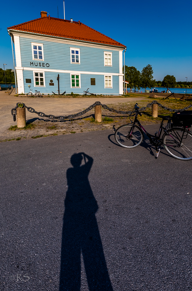 Yritin ottaa myös selfien (tällaiseen sorrun kerran vuodessa): ajatuksena muka loistoidea! Huoh! Koetin tunkea kuvaan tämän kesän omat juttuni: historia, vesi (meri, joki, järvi – ihan sama mikä, mutta vesimaisema!) ja pyörä sekä kuvaaminen. Ajattelin, että jos vaikka uusisin profiilikuvani nettisivuille, mutta enpä kelpuuta moiseen … Jos nyt kuitenkin tähän. No näkyy siitä että oli tulossa lämmin päivä!