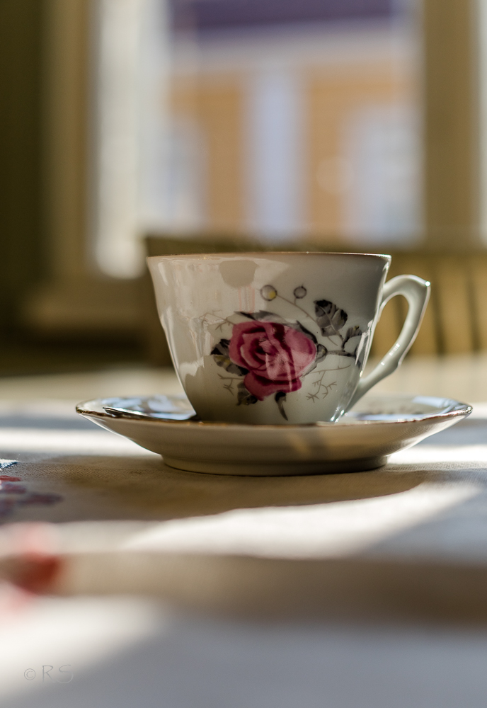Tänään aamiainen oli oikein kelpo, – lämpimät sämpylät ilahduttivat. Pekonia ja nakkeja en kaivannutkaan. Ja astiat olivat miljööseen sopivat. Olisin ollut pettynyt, jollei aamukahvia olisi saanut ruusukupista.