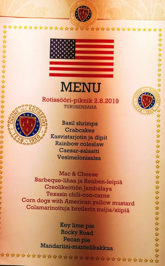 Nyt me olemme nauttineet kaikkien aikojen piknikistä. Paistinkääntäjien piknikin Amerikka-teema oli huikea menestys (toisin kuin minä kerettiläinen olin ajatellut) alku-, pää- ja jälkiruokapöydissä! Kuvan menussa eivät edes ole kaikki mitä oli tarjolla. Eikä kukaan kammoksunut viinejäkään.