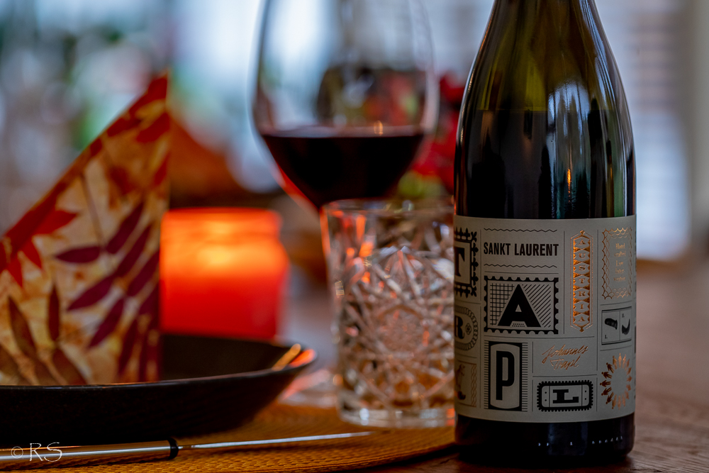 Aikuisilla itävaltalaisen (ranskalaisen?) flambeen seurana itävaltalaista viiniä. Sankt Laurent, Pyhä Lauri, St. Laurence, San Lorenzo … riensi iloksemme. Alkuviini, vähän samea, luomu, vegaaneillekin sopiva punaviini oli aika hintava, ja sillä rahalla saa toki parempiakin, mutta tämä sopi tarte flambeelle tosi hyvin. Ja nyt tarvitaan ”omalta” pyhimykseltä apua, vaikka sunnuntaipäivällisen viinin muodossa. 😉 Trapl Sankt Laurent jää mieleen.