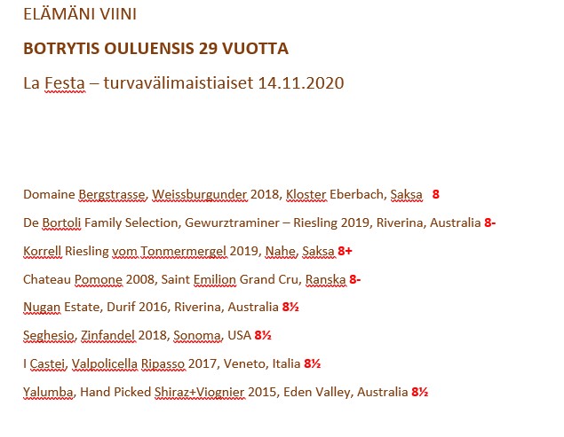 Ihan vaan kotosalla olen saanut viisi kilometriä käveltyä. Eilisen juhlan jälkeen huushollin oletusasetusten palauttaminen = lasitiskiä ja järjestelyjä. Myös ”maistelupöytäkirjan” puhtaaksikirjoitus ja toimittaminen asianosaisille. Lopuksi pakkasimme viinien loput laatikkoon, ja Pehtoori kävi viemässä ne kahden jäsenen karanteerioloihin – Oulunsalossa on tänään kahden hengen ”jälkimaistelut”. Toivottavasti ensi vuonna kun kerhomme täyttää 30 vuotta, voimme kaikki olla yhtä aikaa samassa tilassa juhlistamassa yhteistä taivalta. (alla maistellut viinit pisteineen. I Castei oli mun ja Seghesio Zinfandel Pehtoorin)