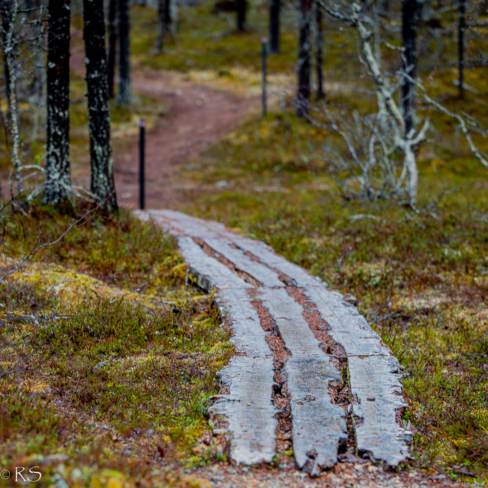 Ylitimme tykky/säilölumiladun, jolla näytti käyvän kuhina. Keski-iältään 75-vuotiaat suihkivat ladulla hurjaa vauhtia intopinkeänä. Me katselimme – ihan vain vähän liki ”alkuasukas”-ilme kasvoilla kummissamme moista touhua – ja lähdimme patikalle Aurorapolulle, ja siitä mutkin ja kiertäen etäämmälle …
