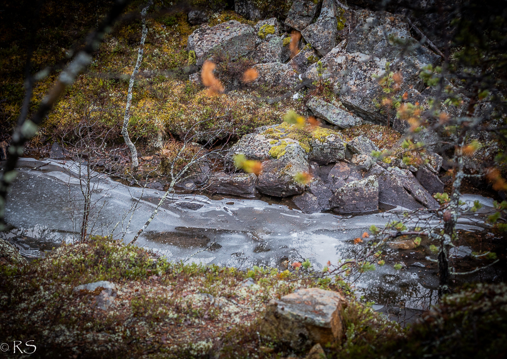 Mutta edelleen!!: Me olimme ulkona! Juuri niiden kahden lilki sateettoman ja lähes valoisan tunnin aikana, jotka keskipäivällä täällä olivat tarkoin havannoiden nähtävissä. Totta puhuen välillä tihuutti ja satoi jotain rännänsekaista jäähilettä, mutta ei ollut kylmä, tosin tunturin kupeessa aika tuulista, kurun pohjalla kuitenkin suojaisaa.