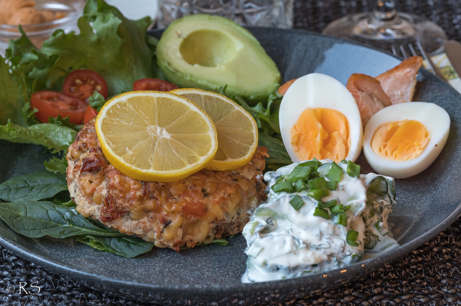 Sainpa sitten lähtiessä pussukallisen tuotteita mukaani… ennen kokemattomia lohipihvejä. Mozzarella-aurinkokuivattutomaatti ja feta-oliivi. Isoja pihvejä, joista M. sanoi, että kannattaa syödä kylmänä. Niin teimme. Tein oheen Siggpac-kurkkusalaatin (yhdenlainen versio tsatsikista), pinaattisalaattia, avokadon puolikkaat ja kananmuna, sekä tuoretta maalaisleipää (Hallissa Puistola Bakeryssä on ihanaa vehnähapanjuurileipää! tai K-kaupan Lombardian leipä) sekä Kitkan levitettä (jota sitäkin saa kalapuodista, se on monikäyttöinen, voileipäkakkuihin, croissantin väliin, uuniperunoiden kanssa, paahtoleivälle, – vuosia sitten taisin käyttää sitä kyllästymiseen asti. Nyt tauon jälkeen maistui taas oikeinkin hyvälle). Kaikkinensa olipa helppoa, hyvää lauantairuokaa. Sen ohessa espanjalainen Turonia Albariño En epäile, ettenkö hankkisi ko. viiniä uudelleenkin.