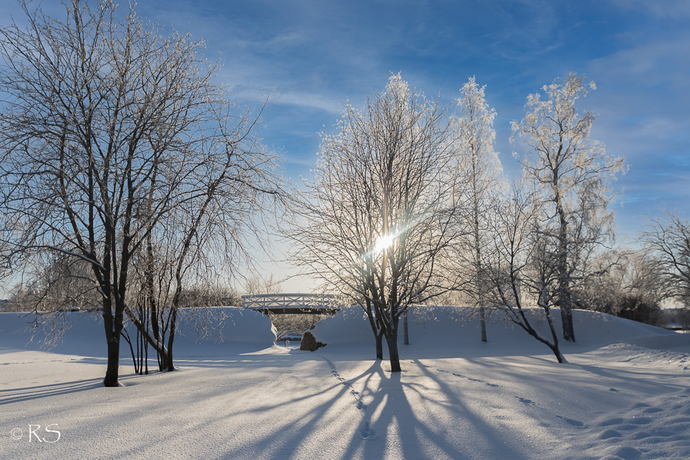 Samalla kaupunkireissulla kuljin kameran kanssa. Valon ja varjon raja on vahva. Sinivalkoinen maisema hallitseva. Onhan tämä poikkeuksellisen kaunista ollut jo pitkään.
