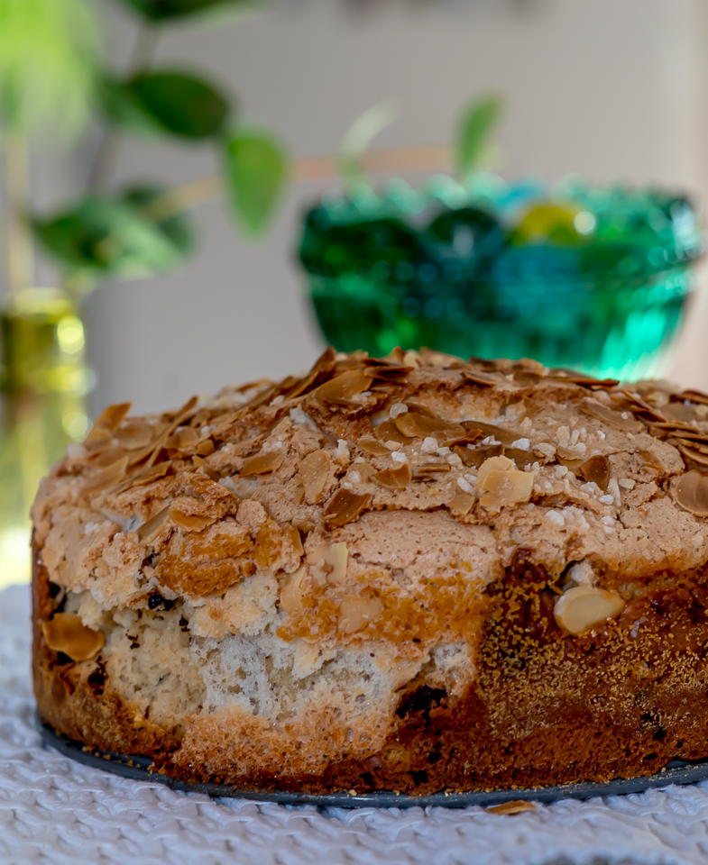 Laita taikina yhteen isoon tai kahteen pieneen vuokaan, kohota kolmisen tuntia ja tee päällys. Vatkaa valkuaiset kevyesti, lisää mantelijauhe ja tomusokeri ja levitä seos kohonneen pullan päälle, koristele manteleilla (tai mantelilastuilla) ja raesokerilla.