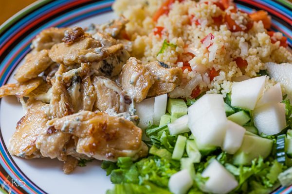 Tee ensin salaatti (hunameloni sopii sinihomejuustoruokien kanssa aina hyvin) ja cuscous-lisuke (tai keitä riisiä).