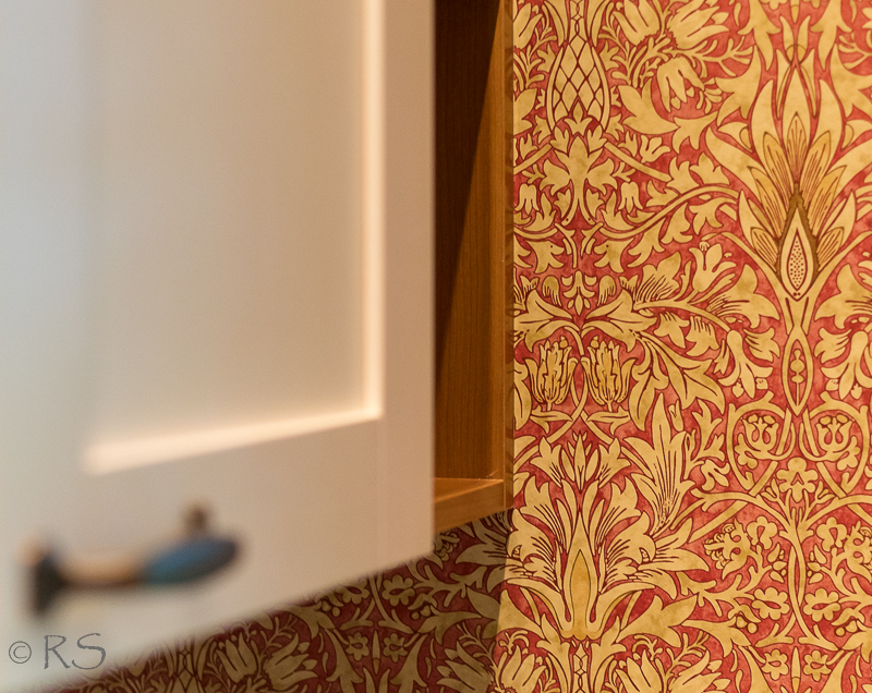 Suurista suunnitelmista liu´uttiin aika maltillisiin ratkaisuihin, mutta ikkunaseinän tapetti on minulta aika ”rohkea” valinta, ja tulos jännitti. Decorassa keväällä tykästyin William Morrisin klassisiin englantilaisiin tapetteihin, ja sellaisen sitten tilasin. Pidän siitä. Se antaa keittiölle nyt ihan uuden tunnelman. Decoran M. on vuosikymmenten aikana ollut meille hyvä sisustussuunnittelija, tietää meidän huushollin, makumaailman ja hän kannusti tähän.
