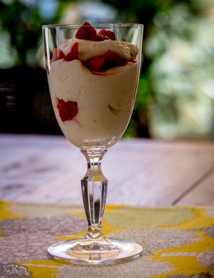 Sitruuna(tuorejuusto)vaahtoa ja mansikoita. Muistutin, että mielelläni useamminkin kuin kerran tai pari vuodessa nautin tällaisesta menusta. 🙂
