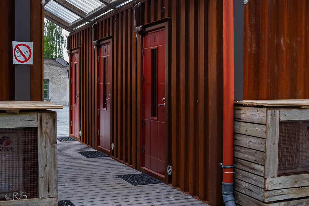 Siellä on kuusi juna/laivakonteista tehtyjä ”hotellihuonetta”, jotka on nostettu entisen ruukki/teollisuushallin katolle. Meidän oli tuo keskimmäinen. Alla oleva kuva on melkein ulko-ovelta, oikealle jää pieni vessa ja suihku. Hyvin mahduimme.