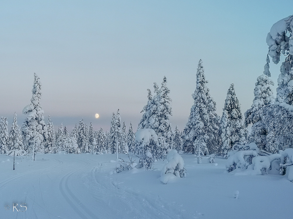 Kuvailin pitkän tovin, mutta hiihdon jälkeen, hiihtokamppeissa, aika lailla paikallaan ollessa, alkoi vilu hiipiä, joten oli lähdettävä pois. Sitä paitsi puolikahden aikoihin taivaantulet, värit, pastellit alkoivatkin hiipua ja haalistua. Lempeä harmaus muuttui ensin siniseksi hetkeksi ja sitten lempeäksi pimeäksi. Nyt jo valaisee kuu.