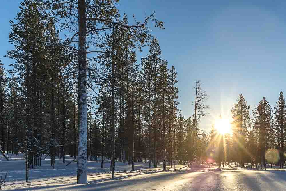 Taivas kirkkaan sininen, keskipäivällä aurinko käy jo korkealla, kolmen jälkeen paistaa vaakasuoraan, mutta vielä silloinkin kirkkaasti. Vitivalkoiset hanget häikäisevät, pienet jääkiteet hangella kuin pikkuisia timantteja. Aamulla pakkasta vain kymmenkunta astetta, mutta lähti pian kirimään melkein kaksinkertaiseksi.