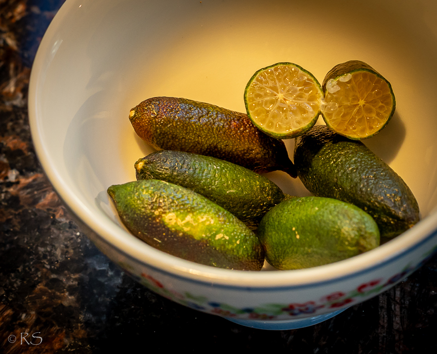 Nämä eivät siis olleet mitään kiivimarjoja, vaan näyttivät pieniltä sitrushedelmiltä. Ne ovat vain noin neljän sentin mittaisia, sormenpaksuisia pikkuisia. Maku oli kuin limen ja ehkä jonkun makean hedelmän, kiivin/viinirypäleen välimuoto. Makua oli kyllä vaikea tunnistaa, sillä noita ei syödä kuorineen, vaan vain nuo pienet pallerot ovat syötäviä, maisteltavaa on aika niukasti. Raikkaita, vähän kirpeitä, koskapa ovat kuin kaviaaria, voisivat olla hyviä vaikka graalilohileivän päällä koristerippusina. Pallerot saa ulos puristamalla hedelmää kevyesti.