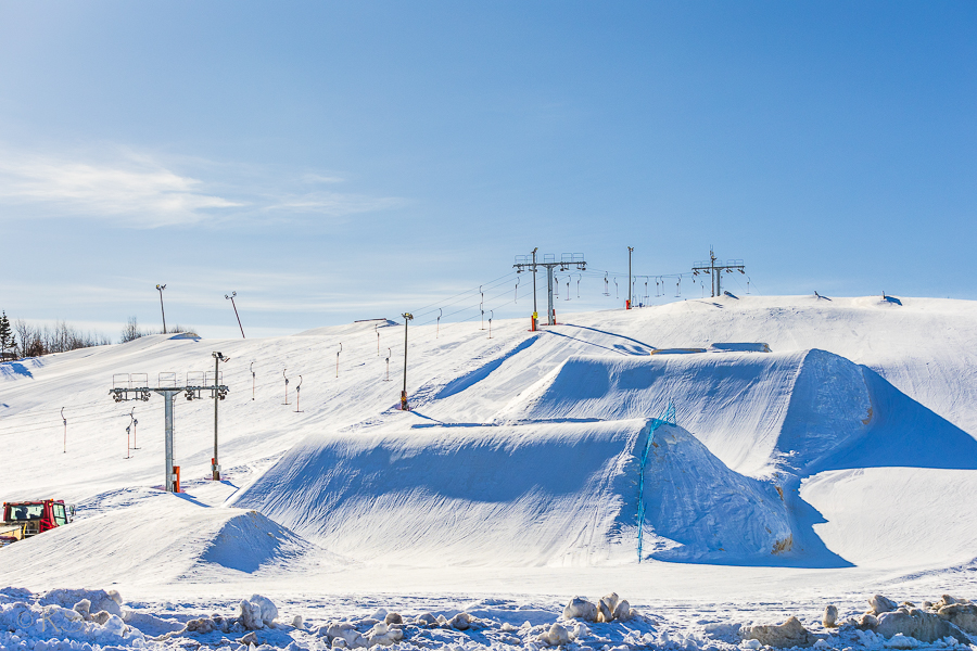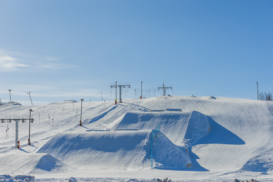 Näissä maisemissa tänään. Pari pakkasastetta, rinne priimakunnossa ja aurinko siniseltä taivaalta. Siis mäkeen? – Mutta kun hissit ei pyörineet!