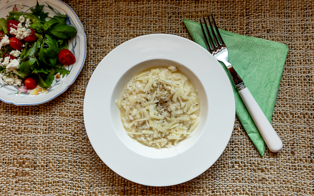Postauksen lopussakin on ”puurokuva”. Se ei ole riisipuuroa, ei aamupuuroa vaan cacio e pepe risottoa – yllätys, yllätys resepti Henkan Italia -kirjasta. Cacio e pepe ~ juustoa (pecorinoa) ja pippuria on tunnettu pastaklassikko, mutta tämäpä onkin risotto. Eikä yllätys ole sekään, että minä risottofani (parsa-, porkkana-, scampi-, samppanja-, tattirisotot ovat meillä paljon yleisimpiä kuin makaronilaatikko tai spaghetti Bolognese) ihastuin tietysti tähänkin. Siis puuroa aamulla ja puuroa päivälliseksi.