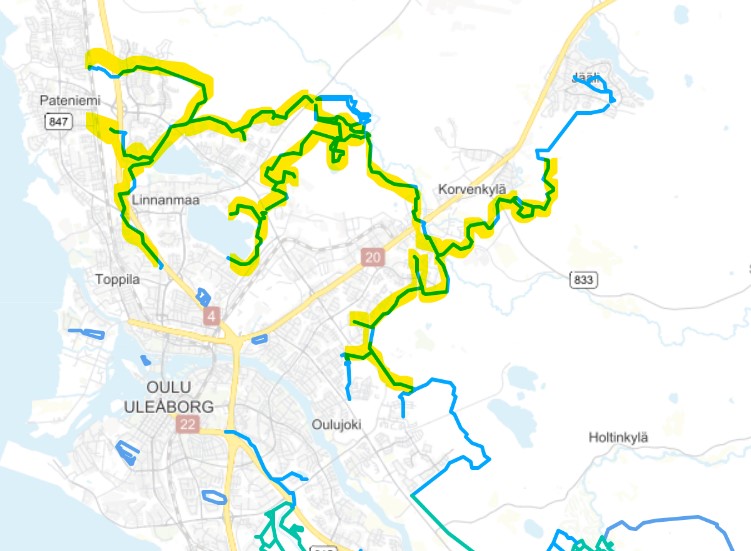 Oulussa olen hiihdellyt näitä latuja. Eestaas. Kaksi kolmasosaa kilometreistä on kertynyt tuolla. Tänä vuonna ei ollenkaan meren jäällä, ei ollenkaan Virpiniemessä.