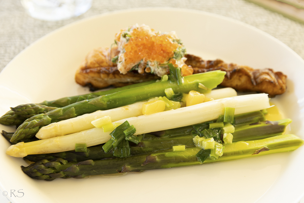 Meillä oli melkoiset parsaöverit! Sunnuntaina Järvenpään K-Citymarketin hevi-tiskissä bongasin violettia hollantilaista parsaa ja olihan se paketillinen kalliista hinnasta (10 € normi nippu) huolimatta ostettava. Tänään sitten tarjolla sekä vihreää, valkoista että violettia parsaa. Pehtoori otti hiiligrillin hupun alta ja grillaili lohta oheen – grillikausikin siis perinteisesti vappuna avattu.