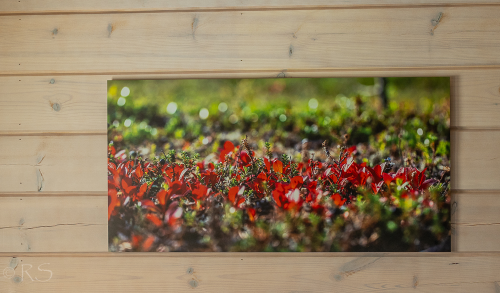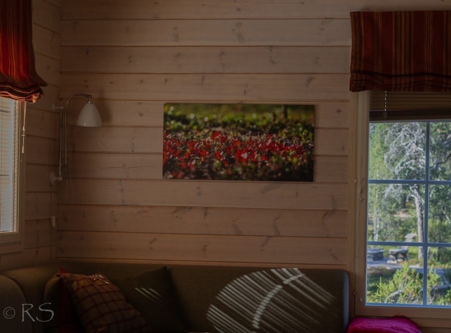 Ja Pehtoorilla sisähommiakin: oli ripustettava taulu, jonka tässä joku aika sitten tilasin ottamastani riekonmarjakuvasta. Aika hyvin se soppii mökin värimaailmaan. Ehkä isommankin olisin voinut tilata. Noh, nyt on tuo ainakin pari vuotta tuossa.
