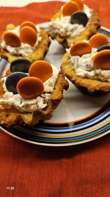 Paluumatka tehtiin mutkan kautta, kiersimme Hangasojan pohjoispuolelta kohti mökkipihaa, jonne laittelimme lyhtyjä, kynttilöitä, linnuille ruokaa. Pyhäinpäivänaaton tunnelmaa. Sitä myös ruokapöydässä. Paistia ja uunijuureksia, ja jälkkärissä annoin periksi halloweenille… Muutoin aika harrasta. 🙂