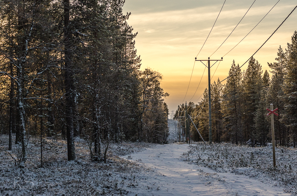 Puolelta päivin taas kimpassa liikkumaan: minun ehdotuksestani – ehkä vähän – ´kummallinen´ lenkki: lähdimme kävelemään sähkölinjan polkua (kuva paluumatkalta) kohti Laanilaa ja Savottakahvilaa (otsikkokuvassa): lounaskahvit mustikkapiirakalla.