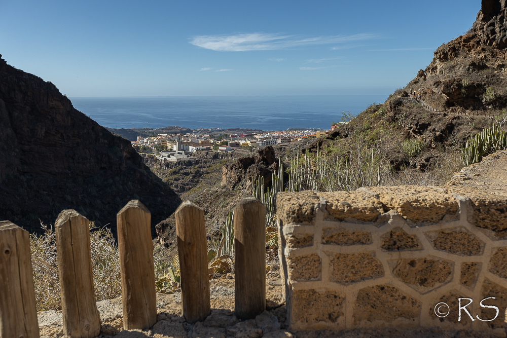 Reitin lähtöpiste on yli 300 mpy, ja matkaa sinne meidän hotellista ainakin viisi kilometriä, joten kävelimme aamulla läheiselle taksitolpalle ja sieltä hiljaisen Costa Adejen ja ylhäällä olevan Adejen kylän läpi mentiinkin vauhdilla. Lähtöportilla oli tarkka opastus ja kypäräpakko. Tänä aamuna vuorilla ei pilviä, ei sumua ja aika lämminkin (+17 C näytti Garmin jo aamulla). Joten ei muuta kuin kohti Helvetin rotkoa.