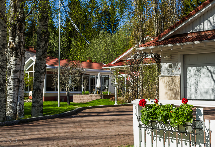 Sinitaivas, alkukesän vihreys ja pelargonioiden puna.