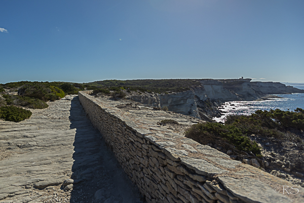 Ennen kuin tutustuimme Bonifacion keskiaikaiseen kaupunkiin, kävimme parin tunnin patikalla seuraillen jyrkkäreunaista rantaviivaa, -korkealla! Tämä Korsikan eteläkärjen kalkkikivien alue on aika ainutlaatuinen, syntynyt on pari miljoona vuotta sitten, ja hiljalleen vuosituhansien aikana se todennäköisesti murenee hiljalleen mereen, ja graniittikallio, joka on sen alla paljastuu. Vain jossain Korsikan keskiosissa on pieni samanlainen kalkkikivikerros. Vaikuttava se on, turkoosisin sininen meren kanssa oli majesteettisen näköinen.