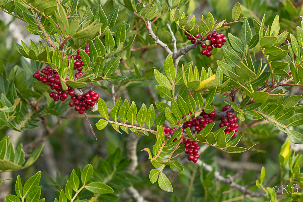 Alkumatkan kilometreillä parasta antia oppaiden jakamat tiedot kasvillisuudesta, villisioista, Roomasta tuoduista (pinja)männyistä, korkkitammista, joista ja joiden käytöstä toki jo Madeiran reissulta meillä oli tietoja, myös ”mastiksista” kertaus tänään. Se on tuo alla olevan kuvan punainen marja, jota käytetään öljyn tekoon, pistaasimaisia makuja siitä saadaan.