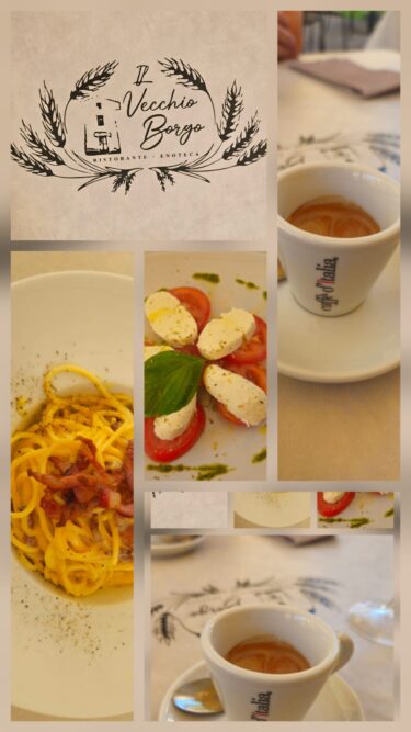 Lounaspaikan löysimme Olbian pääkadun Umberto I:n sivukadulta: Vecchio Borgossa paikallisten välissä ulkopöydässä nautimme perinteistäkin perinteisempää: molempien omat italialaisen keittiön perusherkut: Pehtoorille Pasta Carbonara ja minulle Insalata Caprese!