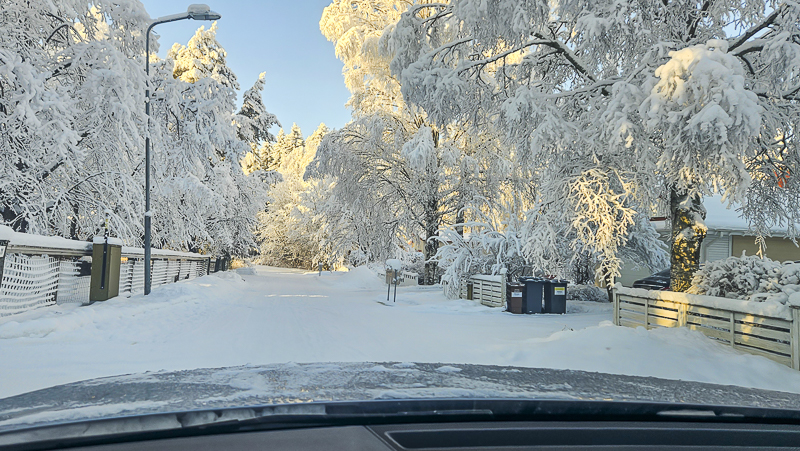 Palasin vähän etuajassa, yhden suunnitelman mukaanhan oli tarkoitus että Pehtoorikin olisi tullut sinne jo torstaina, mutta tilanteet muuttuivat moneen kertaan, niin päätimme, että hän ei tulekaan tällä kertaa ollenkaan ja minä lähden alkuperäissuunnitelmaa aiemmin ajelemaan kotiin. Oltiinkin miehen kanssa edellisen kerran oltu näin pitkä pätkä eri paikkakunnilla sellaiset 43 vuotta sitten. Silloin Pehtoori oli tilausajoreissulla Ranskassa vähän reilun pari viikkoa ja minä olin Oulussa (töissä). Nyt siis 10 päivää eri osoitteissa. Mutta lauantaiaamuna kuudelta lähdin pimeän, aution, pakkasen hyydyttämän Järvenpään majapaikasta kohti koti. Huolimatta että etelän hiihtolomalaisia oli teillä niin aika sujuvasti pääsin huurruuttelemaan; 7 ½ tuntia on tyttären perheen ja meidän välissä.