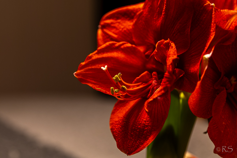 Amaryllis on etuajassa, – toivottavasti jaksaa viikon vielä kukkia.