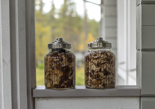 Iltapäivä ja iltakin meni sienisadon kuivauksessa, pillkomisessa, suolauksessa ja säilönnässä kaikkine vaiheineen. Mutta mikäpä siinä. Pihalla enimmäkseen puuhailtiin. Nyt on loppuvuodeksi monenlaisia sieniä pakkasessa ja purkeissa.