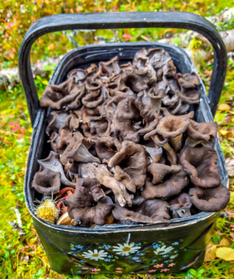 Ja se kertoi, että merkilliset mustat, koskaan ennen näkemättömät torvisienet, ovat mustatorvisieniä, jotka ovat ”hienostuneita, herkullisia ruokasieniä” ja jotka kasvavat eteläisessä ja keskisessä Suomessa. Ja Lapissa, Inarin kunnan etelärajalla! Wuhuu. Ja niitä oli pienellä alueella paljon!