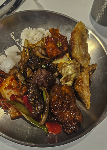 Buffetkin on. Lounasbuffan hinta on tasan 11 €. Siinä oli kevätkääryleitä (pienen pieniä), possua osterikastikkeessa, härkää chilissä, kanaa ja kasviksia hapanimelässä soosissa, riisiä (myös paistettuna), mutta ei nuudeleita – mietin, että mitenhän tässä nyt näkyy se vietnamilainen keittiö? – Ehkä se oli makkarapalaset ja lihapullat, joita myös oli tarjolla. 🙂 En tiedä, oltiinko huonoon aikaan (lounasaika jo vähän ohi? klo 14) mutta makkara ja tarjolla olleen kahvin/teen kanssa ollut Marianne-Domino olivat kaikkein maukkaimpia juttuja. Ruoka oli aika mautonta, ei huonoa, mutta ei siinä kyllä ollut juuri makuakaan. Mutta siisteys ja ”aito”, huikea kitsi-sisustus nostivat rokotelounaan arvosanaa, joka ei kyllä hääppöinen ole sittenkään. 😀 Nälkä kuitenkin lähti.