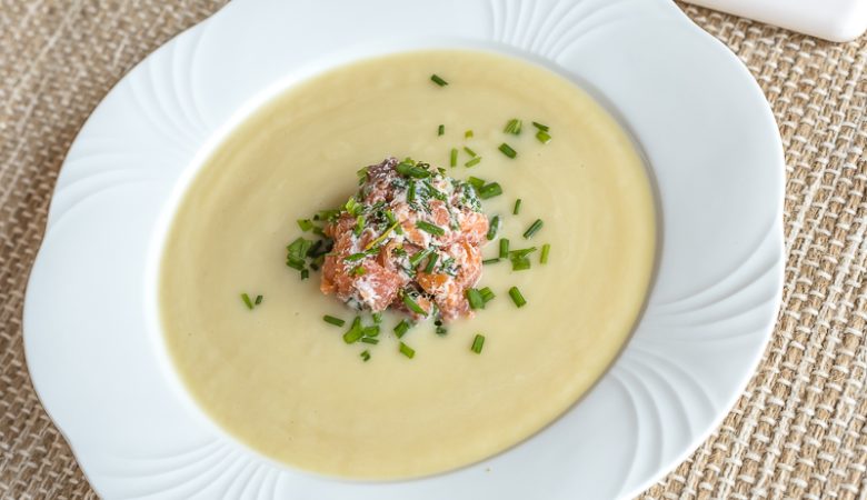 9. Jaa keitto lautasille ja nosta päälle kylmäsavulohitartaria. Tarjoa heti.