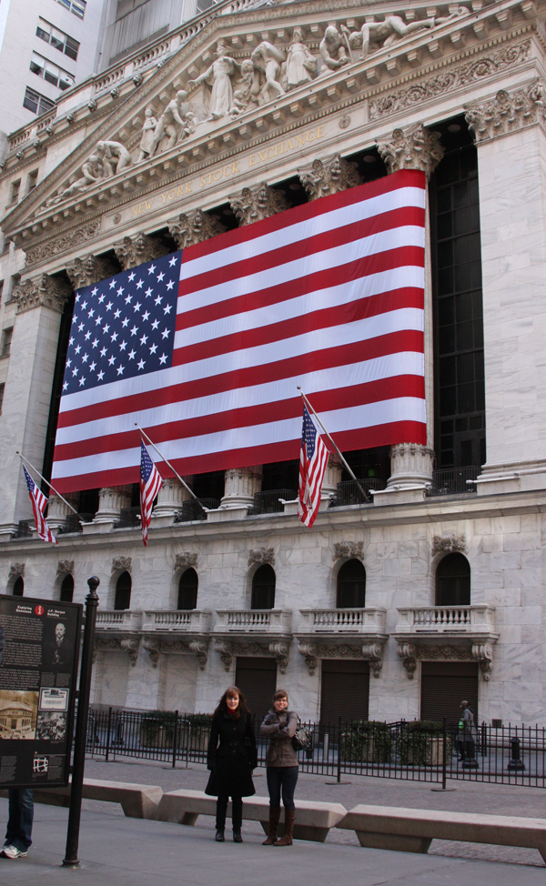 Metrolippu neljälle maksaa 7 dollaria. Linja 4 vie meidät Wall Streetille. Kauppatieteen ylioppilaat asettuvat New York Stockin eteen kuvattavaksi, nauravat ”tänne me tullaan sitte töihin” (kuva suurenee klikkaamalla). Matkalla Battery Parkiin tuulee aina vain kylmemmin, mutta yllättäen rannassa katsellessa Vapauden patsasta aurinko lämmittääkin ihanasti. On loma.